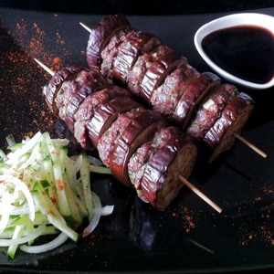 • Нанизать на шпажки колечки баклажанов, чередуя их с котлетками из фарша, примерно равными по размеру.