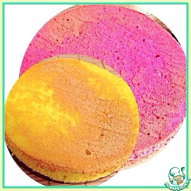 Итак, для начала приготовим два бисквита, один будет розовый, другой желтый.
