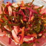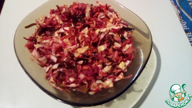Капусту и морковь на 10 мин. замариновать в смеси из соли, сахара и уксуса - все по вкусу, кто как любит, и немного пожать руками.