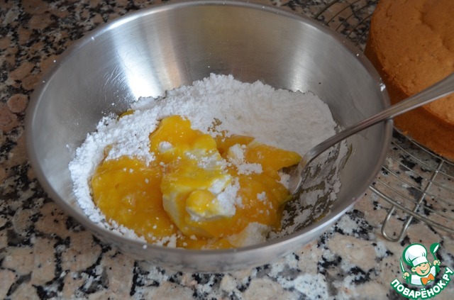 8. Крем из манго: манго очистить от кожуры, срезать мякоть с косточки и измельчить блендером в пюре. Смешать пюре с мягким сыром и сахарной пудрой.