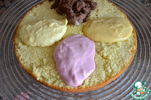 Если вы делаете все четыре крема, то можно комбинировать начинки. Например, поверхность четверти, где внутри малиновый крем, можно намазать шоколадным, ту часть, где внутри ванильный крем, можно намазать сверху малиновым и т. д.