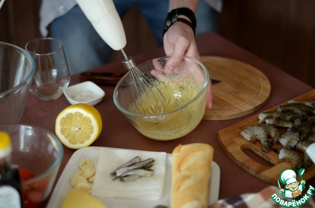 Елаем заправку для салата: отделяем желтки яиц и начинаем взбивать их с горчицей, постепенно добавляя оливковое масло, используем классическое оливковое масло, тк extra virgin испортит вкус заправки. Далее добавляем соль и филе анчоусов (так же можно использовать кильку пряного посола) Натираем чеснок на мелкой терке, добавляем его в смесь, продолжая взбивать. Заправка готова. По консистенции она должна напоминать жидкую сметану.