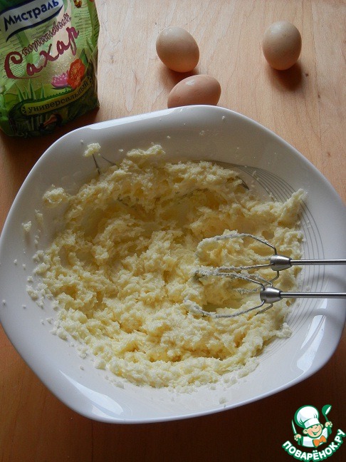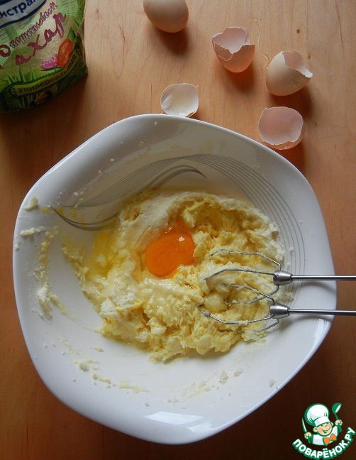 В полученную массу по одному добавляем яйца, каждый раз хорошо взбивая. Получится пышная светлая масса. Если масса немного расслоится, после добавления муки все сровняется