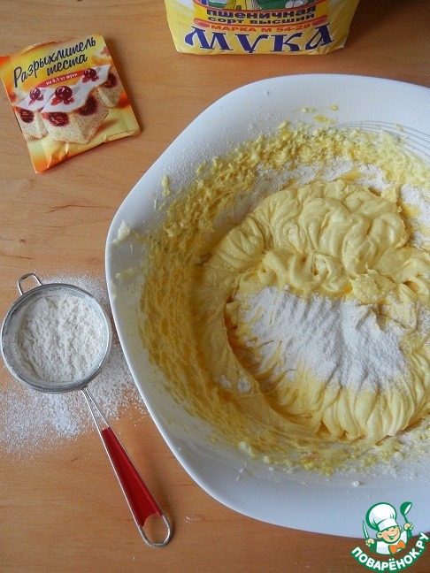 Муку просеиваем с разрыхлителем, добавляем во взбитую массу и хорошо перемешиваем до однородности. Тесто получается густым