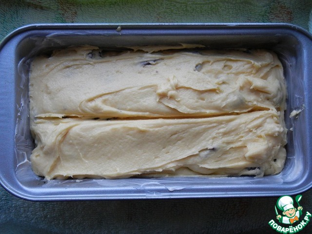 Форму для выпекания смазываем маслом, присыпаем мукой и выкладываем наше тесто. Разравниваем вeрх и пo сeрeдинe кекса делаем продольную бороздку глубиной около 1 см, чтобы в этом месте получилась красивая трещинка