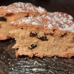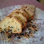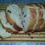 Изюм (у меня достаточно крупный сорт - джамбо) моем и замачиваем в кипятке буквально на пару минут. Затем воду сливаем, обсушиваем изюм и обваливаем в муке. Добавляем его к тесту и хорошо перемешиваем.