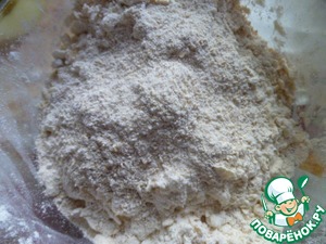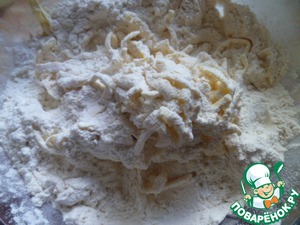 Холодный маргарин натереть на терке, к нему просеять муку смешанную с содой.