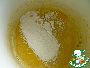 Хорошо перемешать, добавить 200 мл теплого молока и всыпать просеянную муку, хорошо размешать.