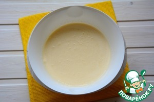 Добавить растопленное сливочное масло и простоквашу, аккуратно размешать венчиком. Предварительно соду погасить простоквашей.