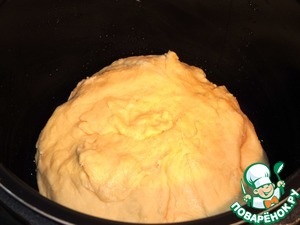 Постепенно соединить мучную и молочную смеси и замесить тесто. Скатать его в шар и положить в теплое место походить.