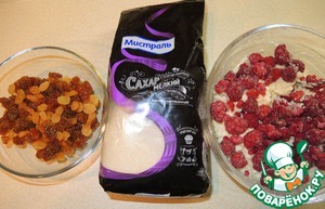 Для начинки творог смешать с тростниковым сахаром (желательно мелкий от "Мистраль"), яйцом и малиной. Изюм на 5 минут замочить в кипятке, затем обсушить.