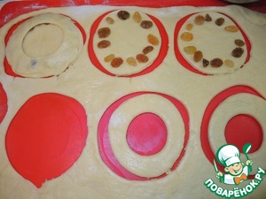Раскатать тесто в пласт толщиной 4-5мм и вырезать одинаковые кружки, диаметром примерно 7-8см. У половины кружков вырезать серединку, диаметром примерно 2-3см. На целые кружки теста по кругу, немного отступив от края положить изюминки (это и есть секретик), накрыть кружком теста с дырочкой в серединке.