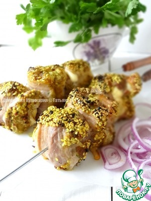 Если хочется солнечного и яркого шашлычка, предлагаю приготовить такой шашлычок из свинины, маринованной в лаймовом соке с соевым соусом, нанизанного рулетиками с сыром и обваленным в золотистой смеси специй с кунжутом! Очень ароматный, красивый, нежный на вкус шашлычок быстрого приготовления!