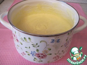 Желтки растереть с 1 стаканом сахара, влить молоко, размешать, добавить муку, еще раз перемешать.