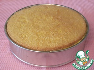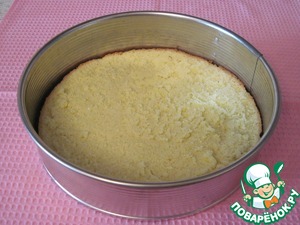 Готовый бисквит извлечь из формы. Остудить, разделить на 2 части. Одну часть уложить в разъемную форму, в которой его пекли.