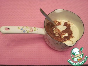 Затем начинаем готовить глазурь. Для этого смешать сметану, сахар, какао в маленькой кастрюльке, поставить ее на огонь и, непрерывно помешивая, ждать загустения массы, потом добавить масло и еще немного проварить массу.