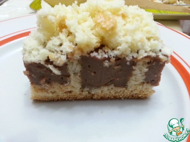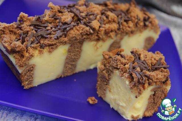 Чтобы знать место, где точно будут разрезы, я помечаю их зубочисткой. Затем посыпаю ванильный пудинг бисквитной крошкой и немного прижимаю. Убираю десерт для застывания пудинга в холодильник (я убирала в холодильник на ночь). Нарезаю десерт на кусочки. Приятного Вам аппетита!
