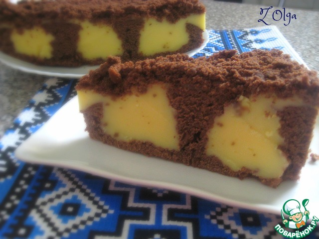 Существует много рецептов приготовления бисквита на кипятке или кипящем молоке. Предлагаю приготовить десерт из шоколадного бисквита на кипящем молоке с ванильным пудингом, рецепт которого найден мной на болгарском кулинарном сайте.