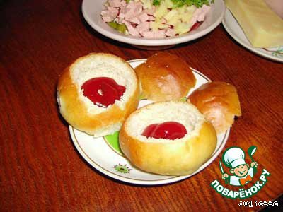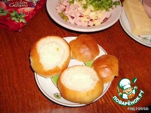 У булочек тонко срезать верхушки, аккруратно ножом вырезать сердцевину и удалить мякиш, насколько это возможно.