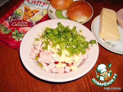 Зелень. При желании также можно использовать: грибы, лук, маслины, горошек и т. п.