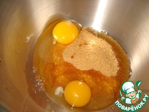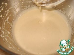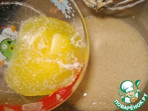 Кефир влить в яично-сахарную массу. Добавить растопленное сливочное масло.