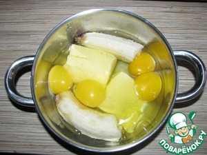 Смешать мягкое масло, 4 яйца и спелый банан. Всё размять вилкой.
