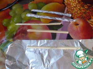 Для этого обломала сухие, но крепкие ветки с дерева, очистила их от кожуры и замотала в фольгу. -