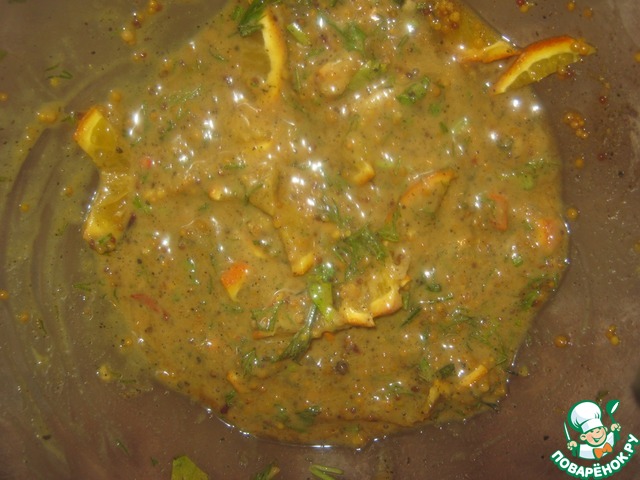 Смешиваем все специи, рубленную зелень, мед, нарезанный апельсин, три вида горчицы с соевым соусом ТМ "Kikkoman"
