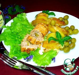 Отбитые части филе полила соусом и распределила его по всей поверхности. На край положила три оливки и скрутила в рулетик.