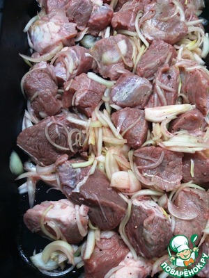 А с утра нас ждало разочарование, прекрасная и солнечная погода вчера превратилась в ливень на целый день сегодня. Мы решили не отчаиваться - мясо-то есть :) и запечь его в духовке. Сливаем маринад, мясо выкладываем на противень вместе с луком и запекаем в духовке при 250С в течение получаса. Или (если погода позволяет) нанизываем куски на шампура и готовим на углях.