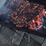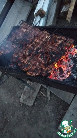 Когда угли почти готовы, сливаем маринад, а курицу нанизываем на шампура. Я делала порционно на шпажках, для этого нужно за час замочить их в воде.