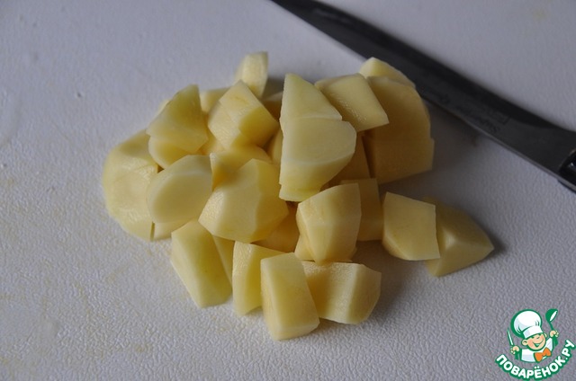 По истечении 30 минут чистим картофель, режем кубиками и кладём в бульон.