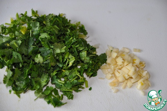 Мелко рубим кинзу и чеснок, без них харчо - не харчо.