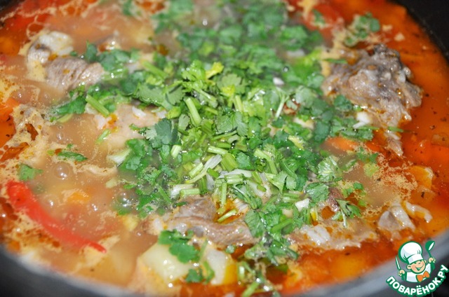 Кладём кинзу и чеснок в харчо, отключаем огонь, даём настояться 10 минут.