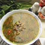 Подаём харчо горячим, иначе бараний жир будет неприятен при застывании, посыпаем обильно кинзой.
