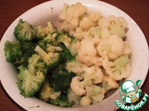 Брокколи и цветную капусту отварить до готовности в соленой воде, вытащить из воду и дать остыть. Разделить на соцветия.