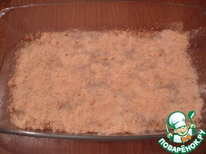 Форму для запекания хорошо смазать растительным маслом и обсыпать дно панировочными сухарями. У меня стеклянная форма объемом 2,4 л. размером 18 см х 30 см х 5 см.