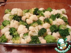На дно формы в шахматном порядке выложить брокколи и цветную капусту.
