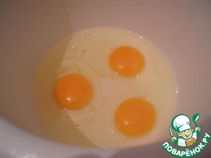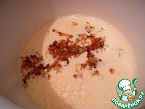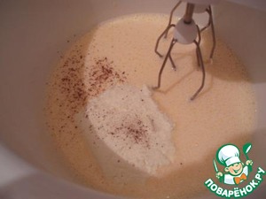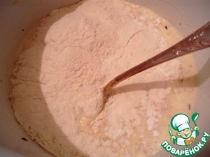Теперь добавить разрыхлитель и муку. Все очень хорошо перемешать. Консистенция теста получается как на оладушки или густой сметаны.