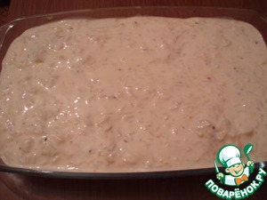 Теперь аккуратно ложкой выкладываем тесто-заливку в форму на капусту. Сначала нужно все выкладывать ложкой, чтобы каждая «дырочка» была покрыта заливкой, а уже остатки можно смело вылить поверх и разровнять. Вот так должно получиться сверху
