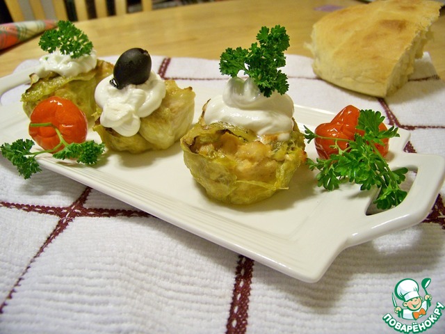 Формочки для кексов смазываем маслом. Капустные листы выкладываем в формочки так, чтобы оставался свисающий край.