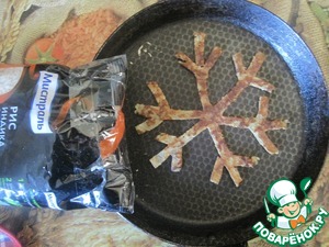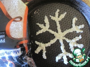 Для приготовления чипсов я оставила рисовую массу 1 ст. л. Выкладываем на смазанную сковороду маслом рисунок чипсов который вам необходим. Я сделала снежинку.