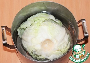 Положить кочан капусты в большую кастрюлю с кипящей водой. Держим капусту в кипящей воде до тех пор, пока верхние листья не начнут отделяться от кочана.