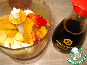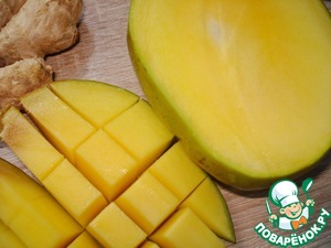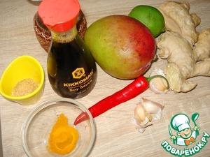В чашу блендера добавляем манго, перец чили, чеснок, соевый соус, карри, сок лайма и сахар, почищенный кусочек имбиря.