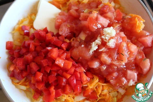 • Помидоры бланшируем, снимаем с них кожицу и мелко режим (мелко - для того чтоб соус быстрей приготовился). Перец тоже мелко режим и добавляем на сковороду вместе с сливочным маслом. Готовим 5 минут.