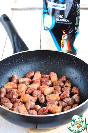Сердечки промыть под проточной водой, обрезать лишний жир и сосуды. Обжарить в небольшом количестве растительного масла до золотистости, добавить нарезанную грудинку.
