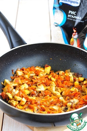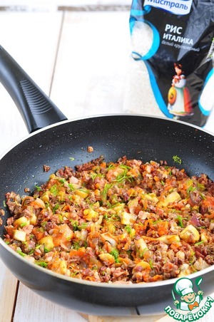 Добавить полуготовый рис, посолить, поперчить, хорошо перемешать, немного остудить.