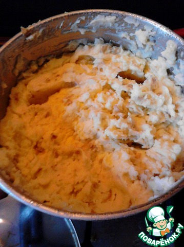 Первым делом отваривает картофель в соленой воде до готовности. Откидываем на дуршлаг, в кастрюле разогреваем молоко со сливочным маслом, пересыпаем обратно картофель, добавляем яйца и делаем пюре.