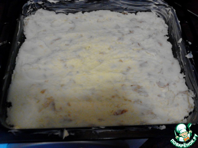 Выкладываем вторую половину пюре, разравниваем, посыпаем тертым сыром.
