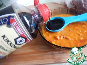 Облепиху разминаем, добавляем соевый соус, рубленный чеснок и молотый перец. Перемешиваем маринад. -
